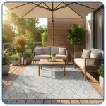 Dywan na tarasie lub balkonie pozwala stworzyć przytulną strefę wypoczynku, podobną do salonu w domu. W ofercie Strado znajdziesz dywany zewnętrzne w różnych kolorach, wzorach i rozmiarach, które można łatwo dopasować do mebli ogrodowych i stylu aranżacji.