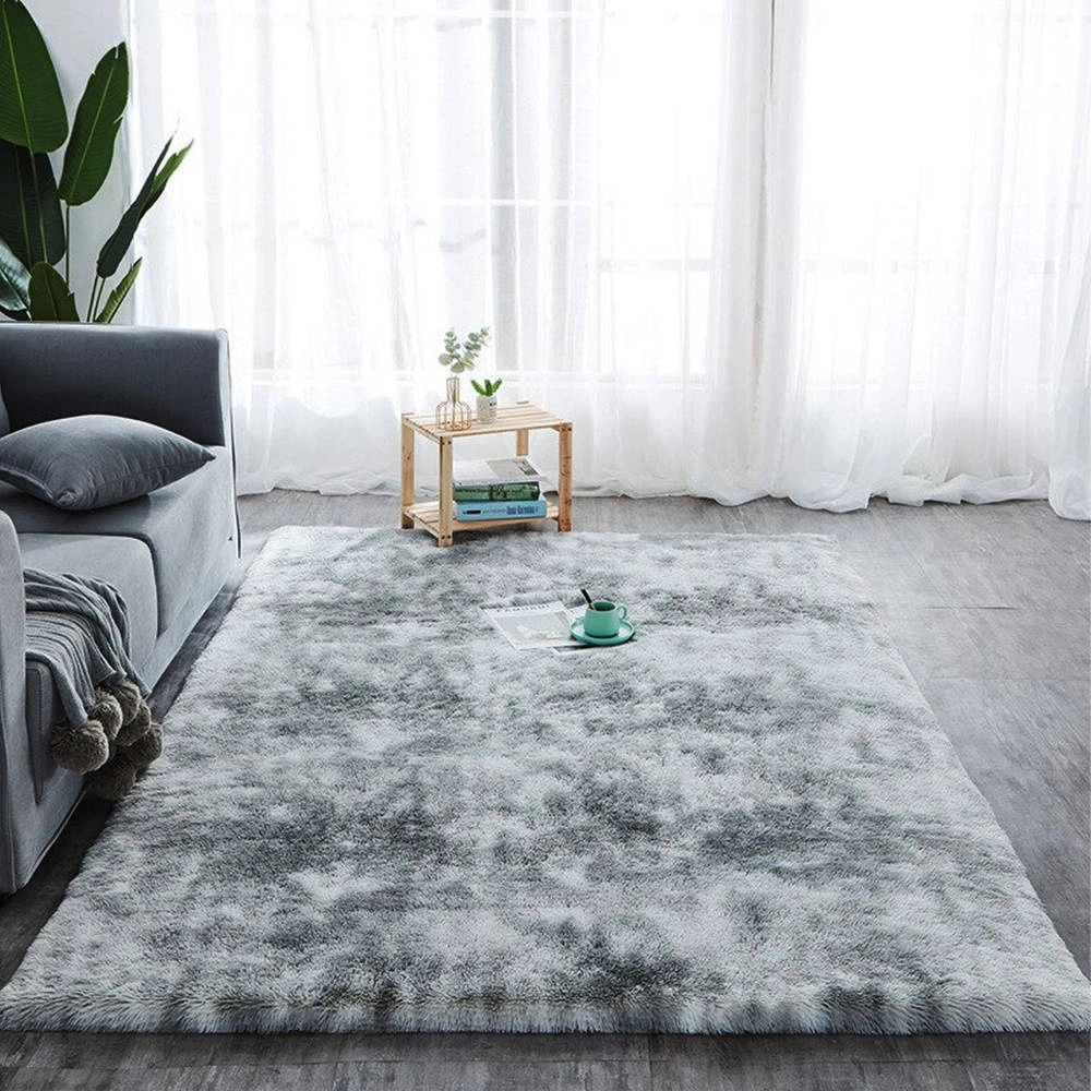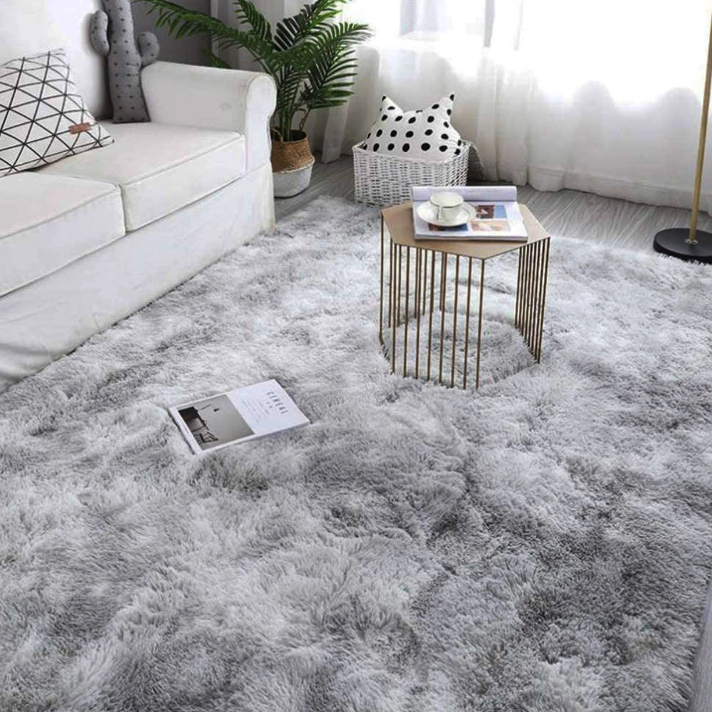 - Puszysty miękki dywan o wymiarach 140x200 cm długie włosie 3.5 cm antypoślizgowy spód prostokątny jasnoszary kolor wykonany z materiałów syntetycznych łatwy w utrzymaniu czystości uniwersalny design do nowoczesnych i klasycznych wnętrz