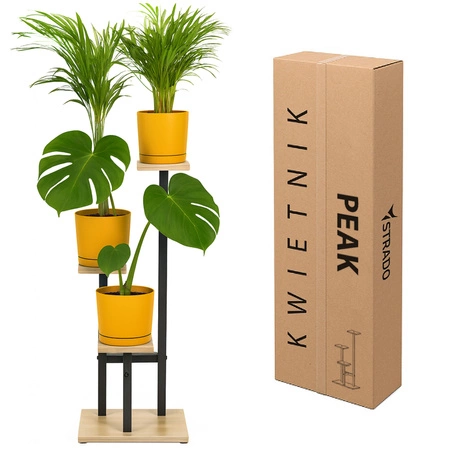 - Czarny kwietnik PEAK to elegancki, 3-poziomowy stojak na kwiaty, mieszczący 3 doniczki. Solidna metalowa konstrukcja zapewnia stabilność, a nowoczesny design w stylu loftowym podkreśla piękno roślin, idealnie komponując się w salonie, biurze czy na taras