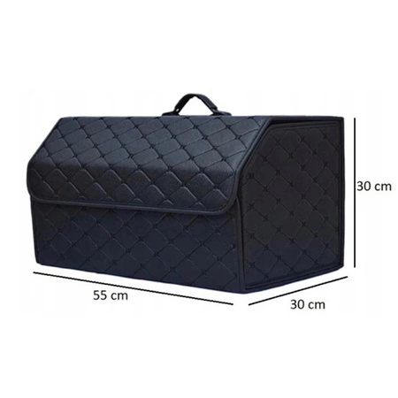 - Pojemny składany organizer do bagażnika samochodu z eleganckim pikowanym wykończeniem. Idealny na zakupy narzędzia i akcesoria. Wzmocnione ścianki i uchwyty zapewniają trwałość. Łatwy do przenoszenia i składania utrzymuje porządek w aucie.