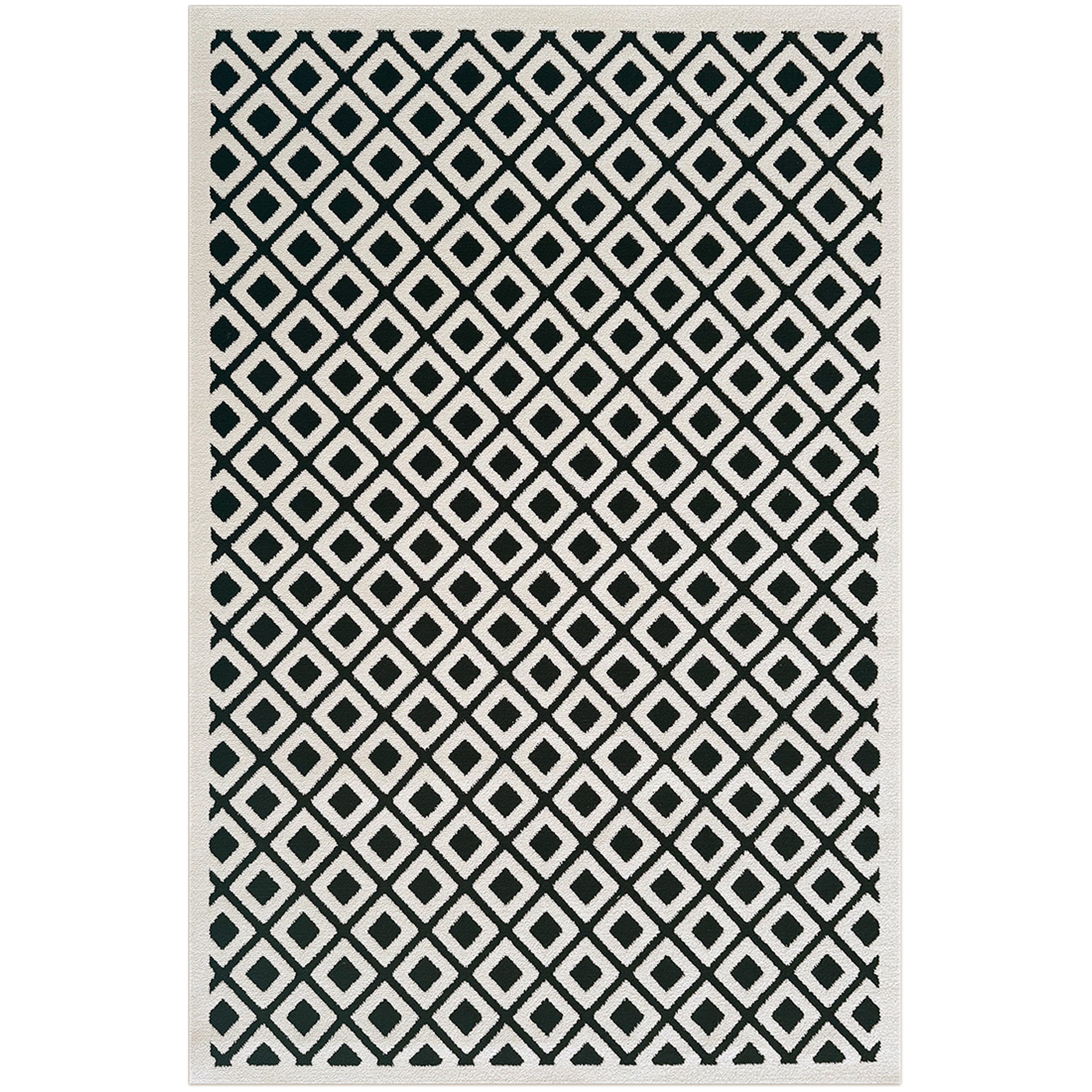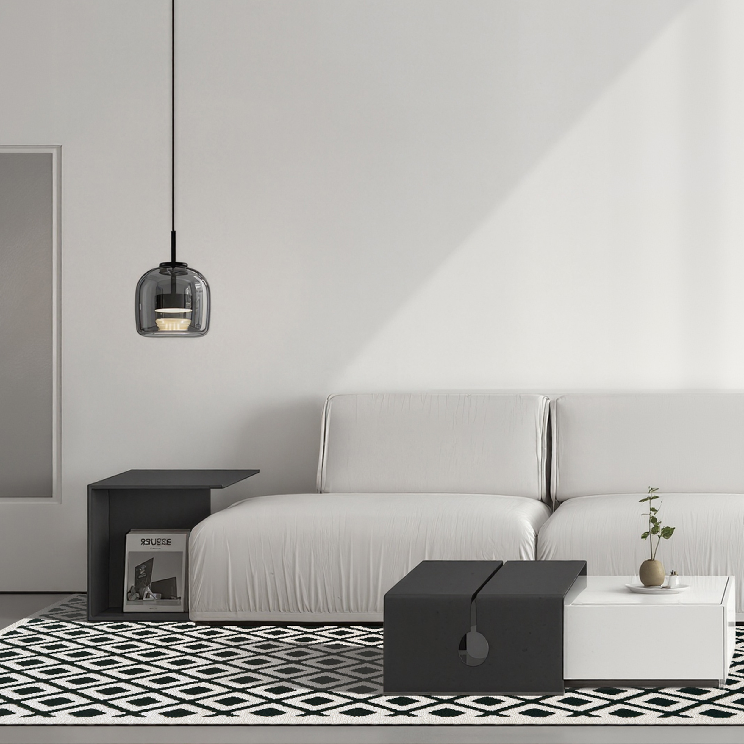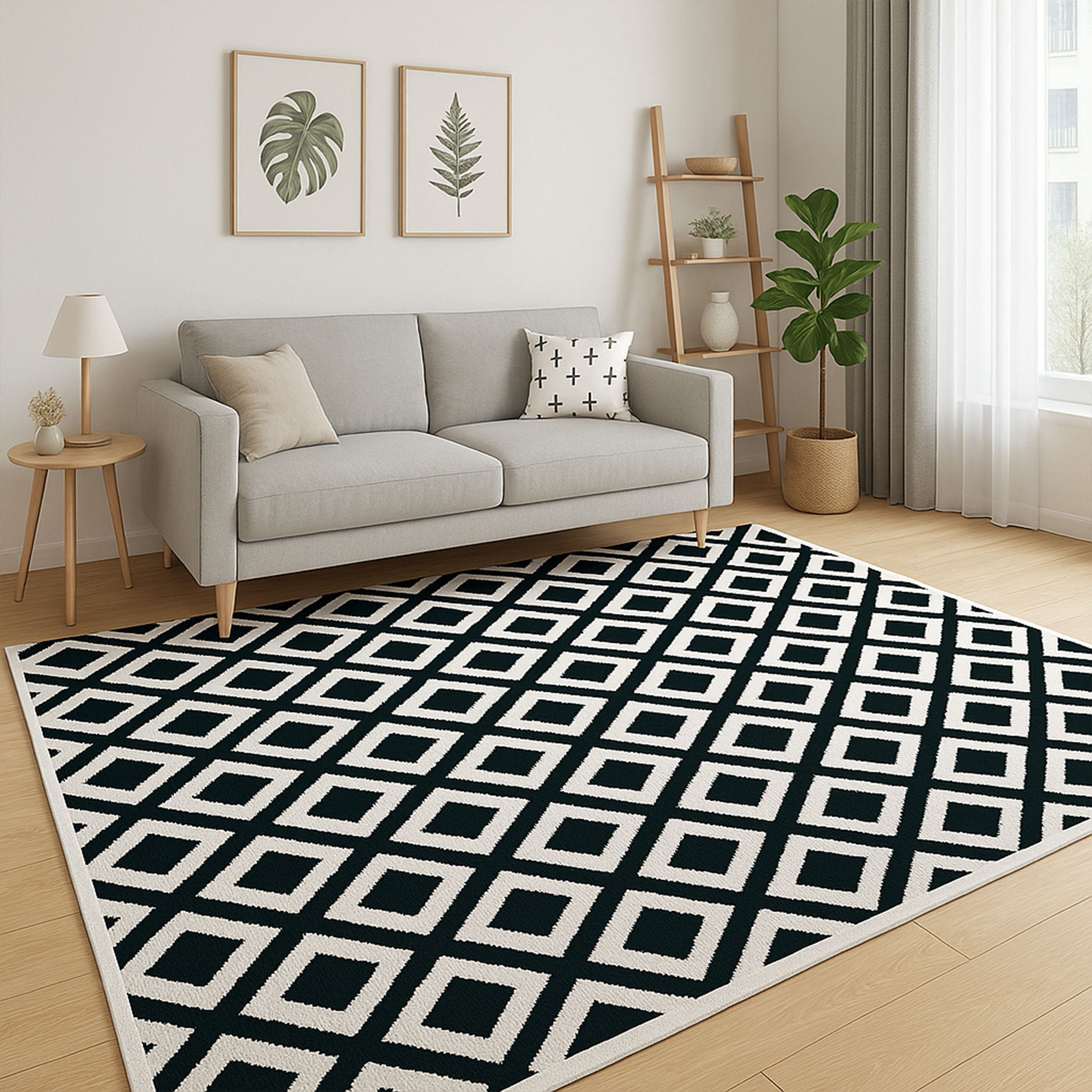 - Jasne tło dywanu rozjaśnia przestrzeń, a geometryczny motyw przełamuje prostotę skandynawskich wnętrz.