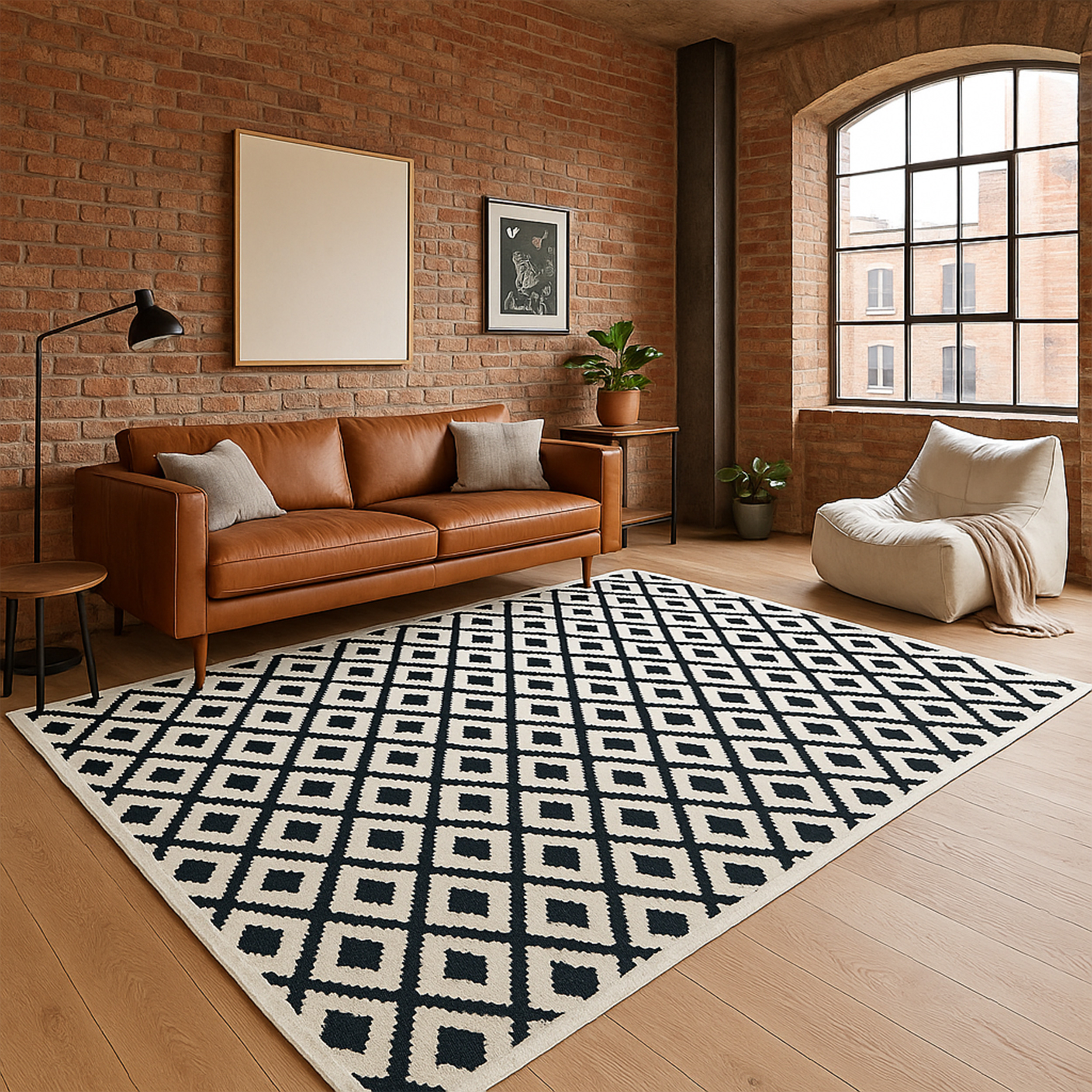 - Jasne tło dywanu rozjaśnia przestrzeń, a geometryczny motyw przełamuje prostotę skandynawskich wnętrz.