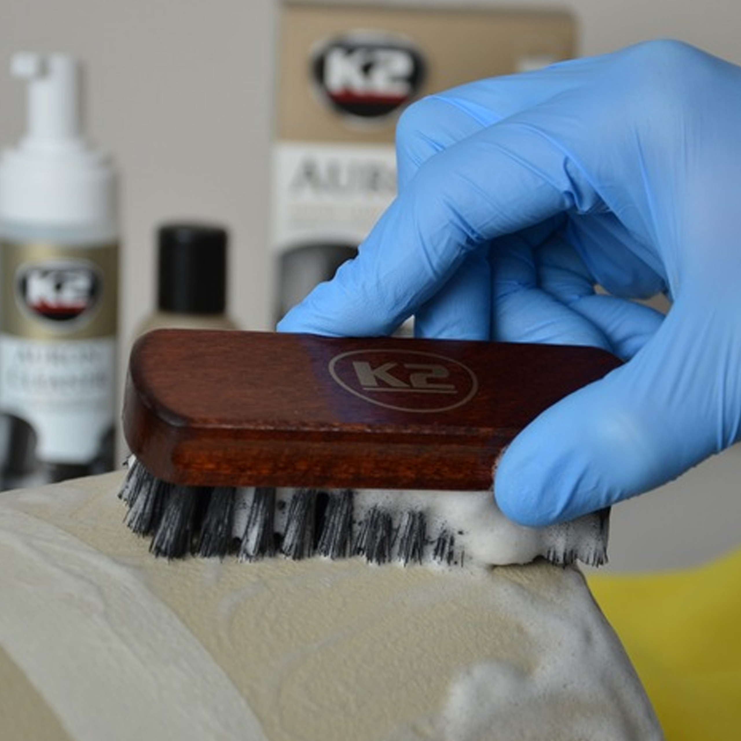 Producent rekomenduje stosowanie szczotki ze środkami do czyszczenia skóry z linii Auron (np. K2 Auron Cleaner / K2 Auron Cleaner Strong) oraz do tkanin z preparatem K2 Tapis.