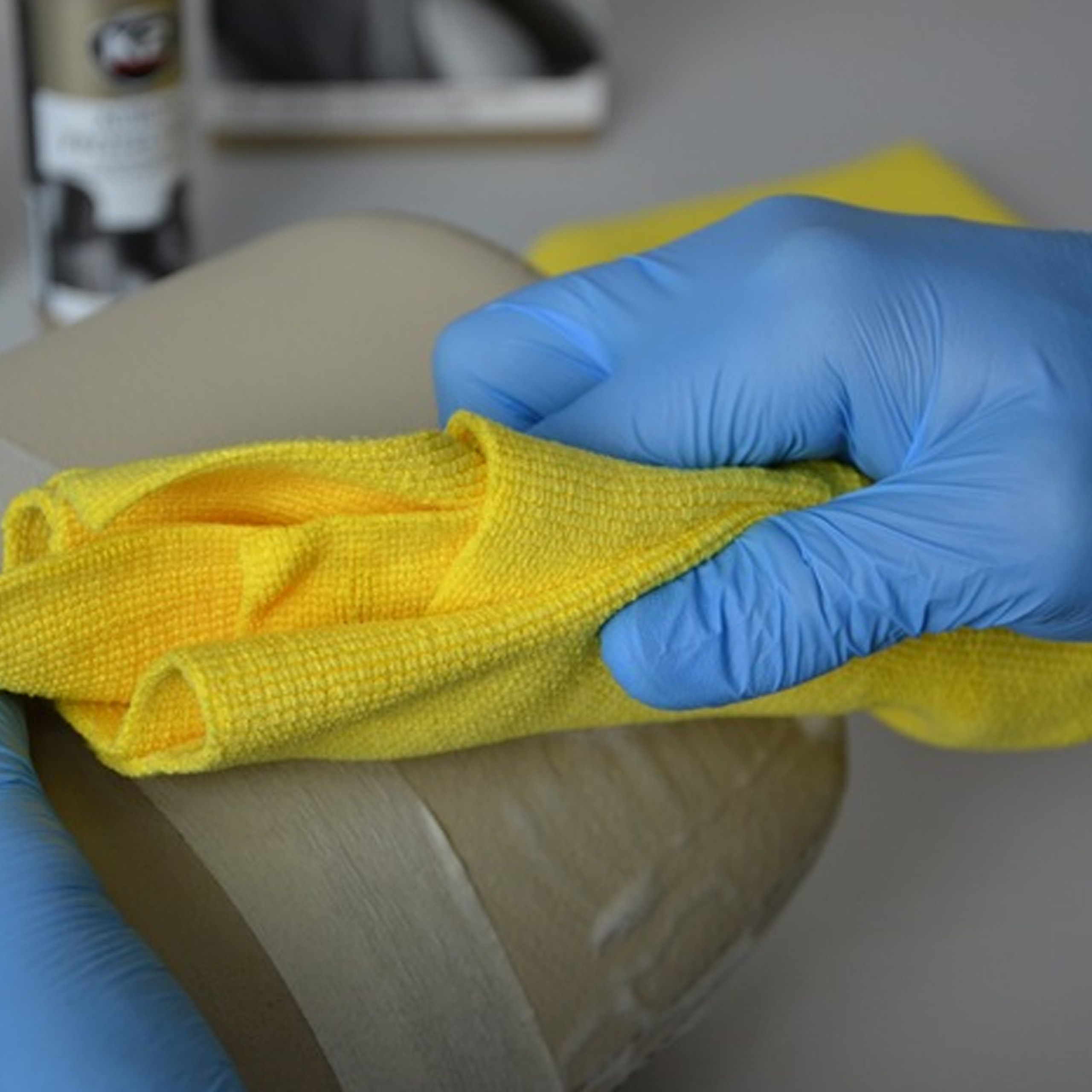 - Zbierz zabrudzenia czystą mikrofibrą (zgodnie z zaleceniami użytego środka).