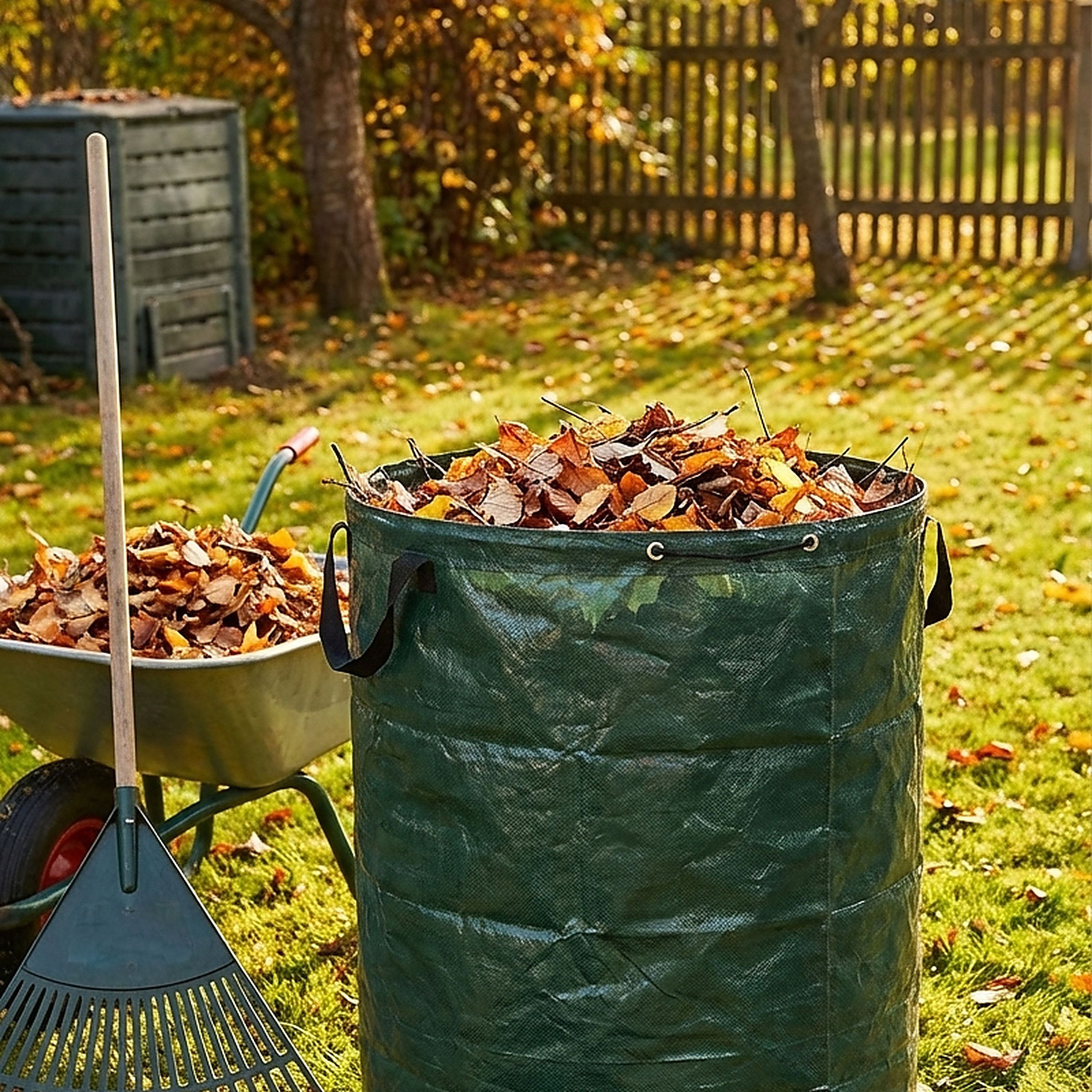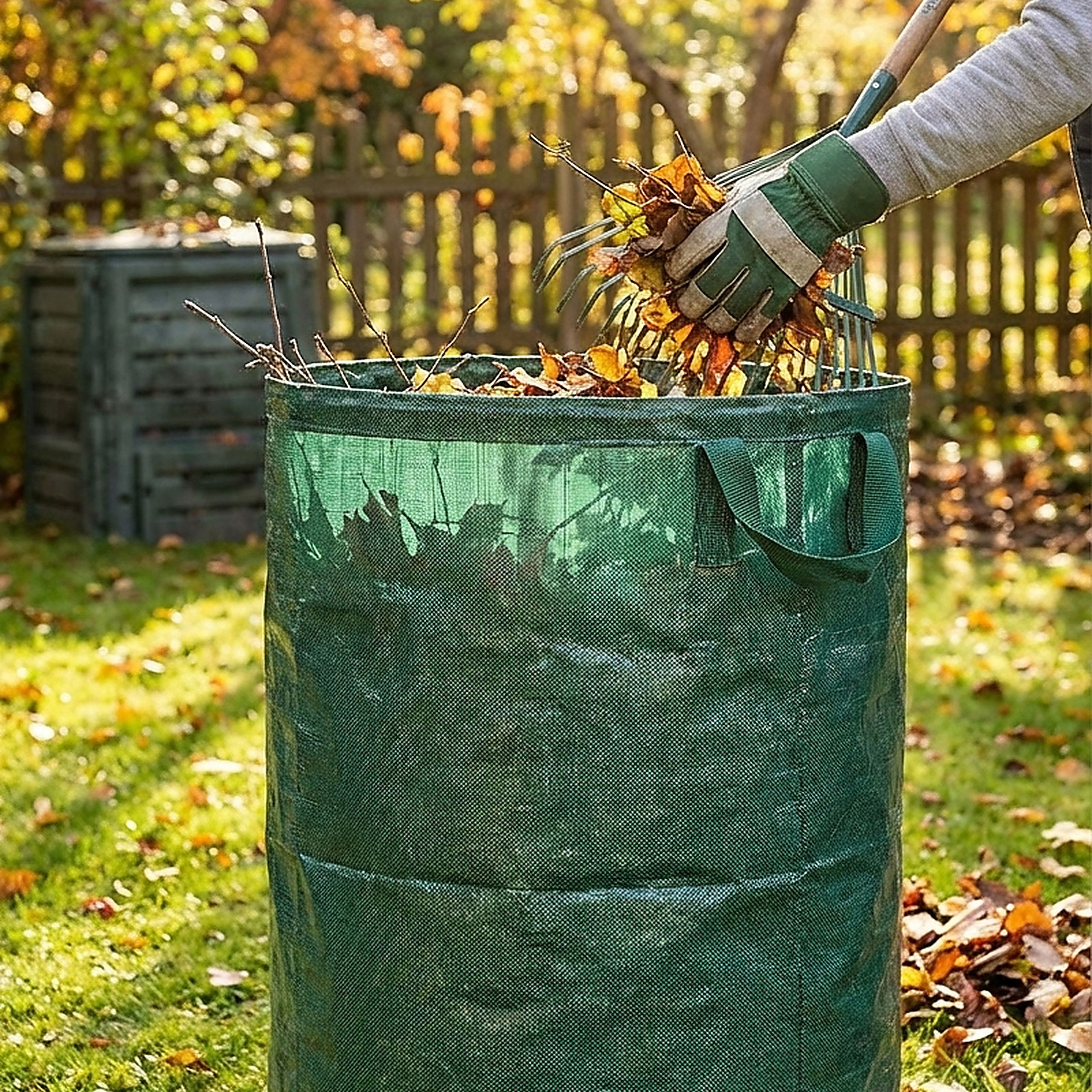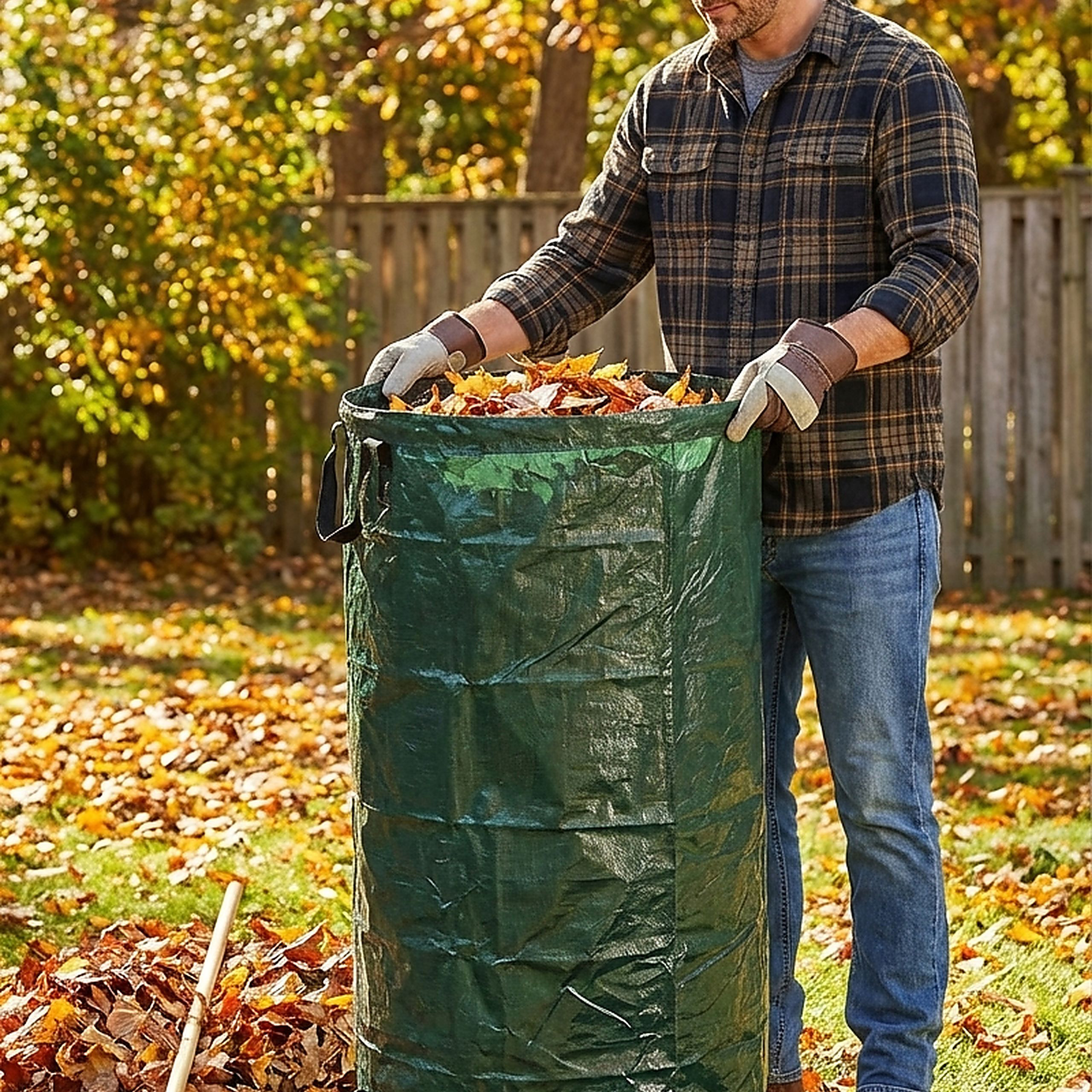Produkt wyposażono w solidne uchwyty, które ułatwiają transportowanie nawet pełnego worka. Po złożeniu zajmuje on bardzo mało miejsca, co pozwala na wygodne przechowywanie go w garażu czy schowku na narzędzia.
