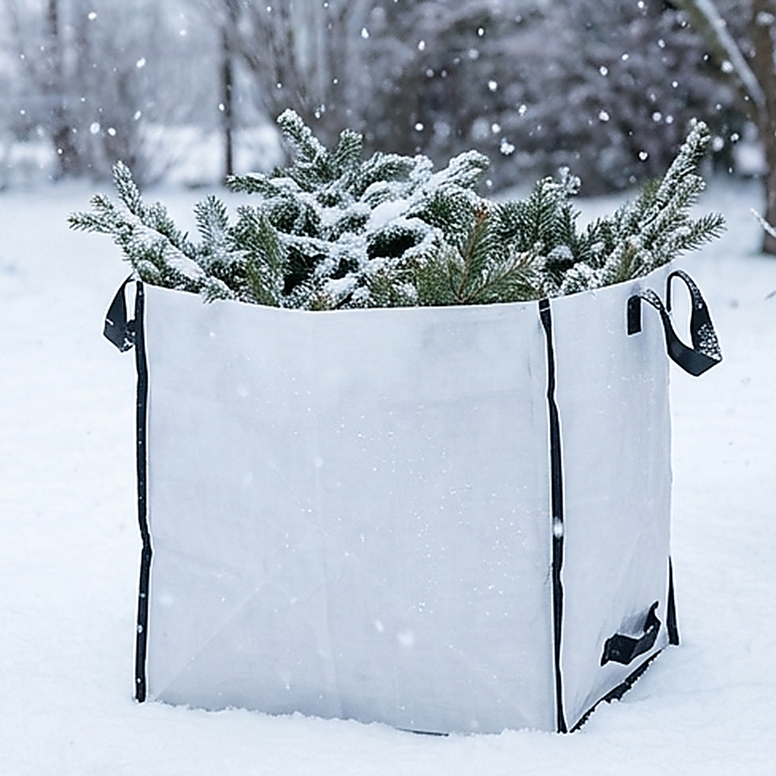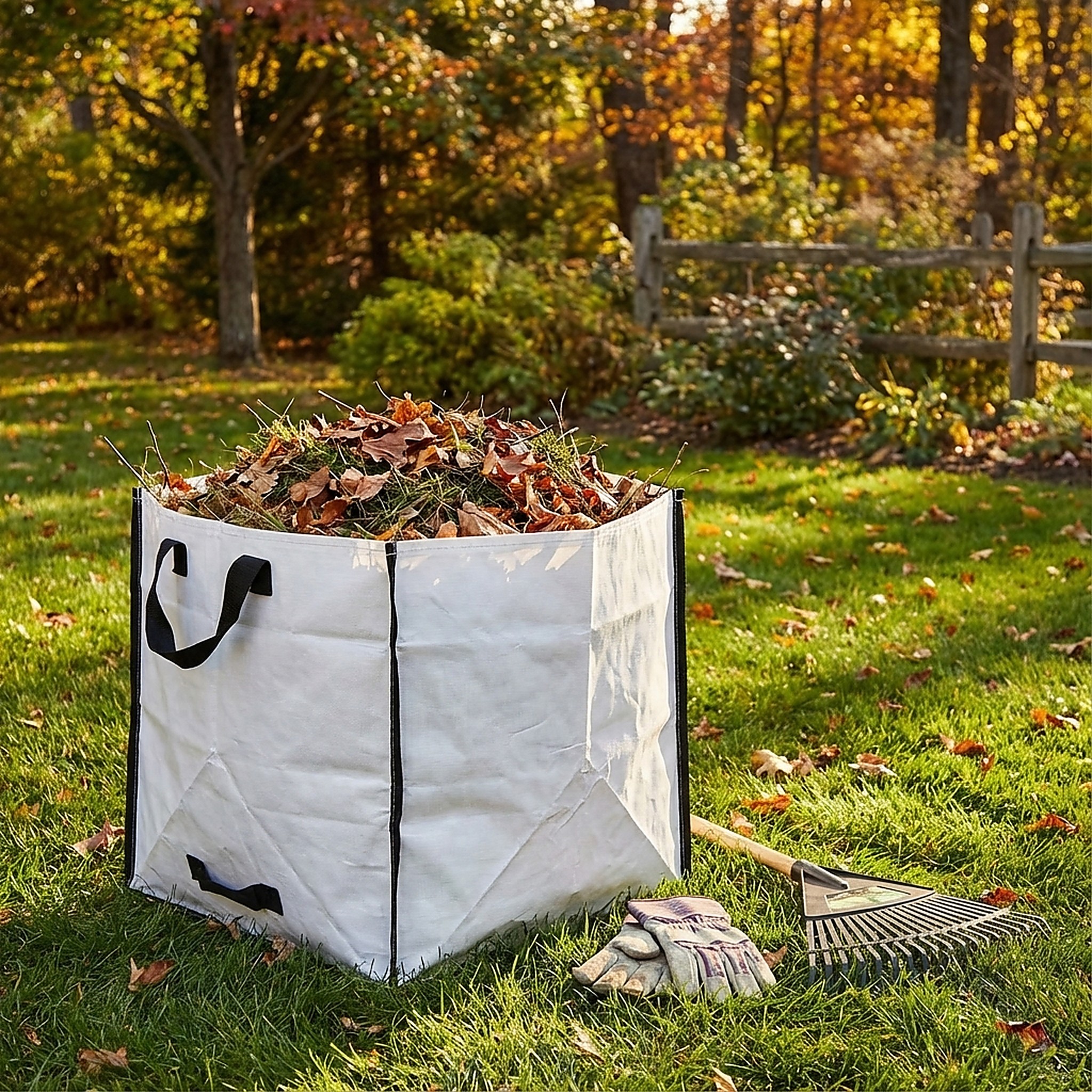 Produkt wyposażono w solidne uchwyty, które ułatwiają transportowanie nawet pełnego worka. Po złożeniu zajmuje on bardzo mało miejsca, co pozwala na wygodne przechowywanie go w garażu czy schowku na narzędzia.