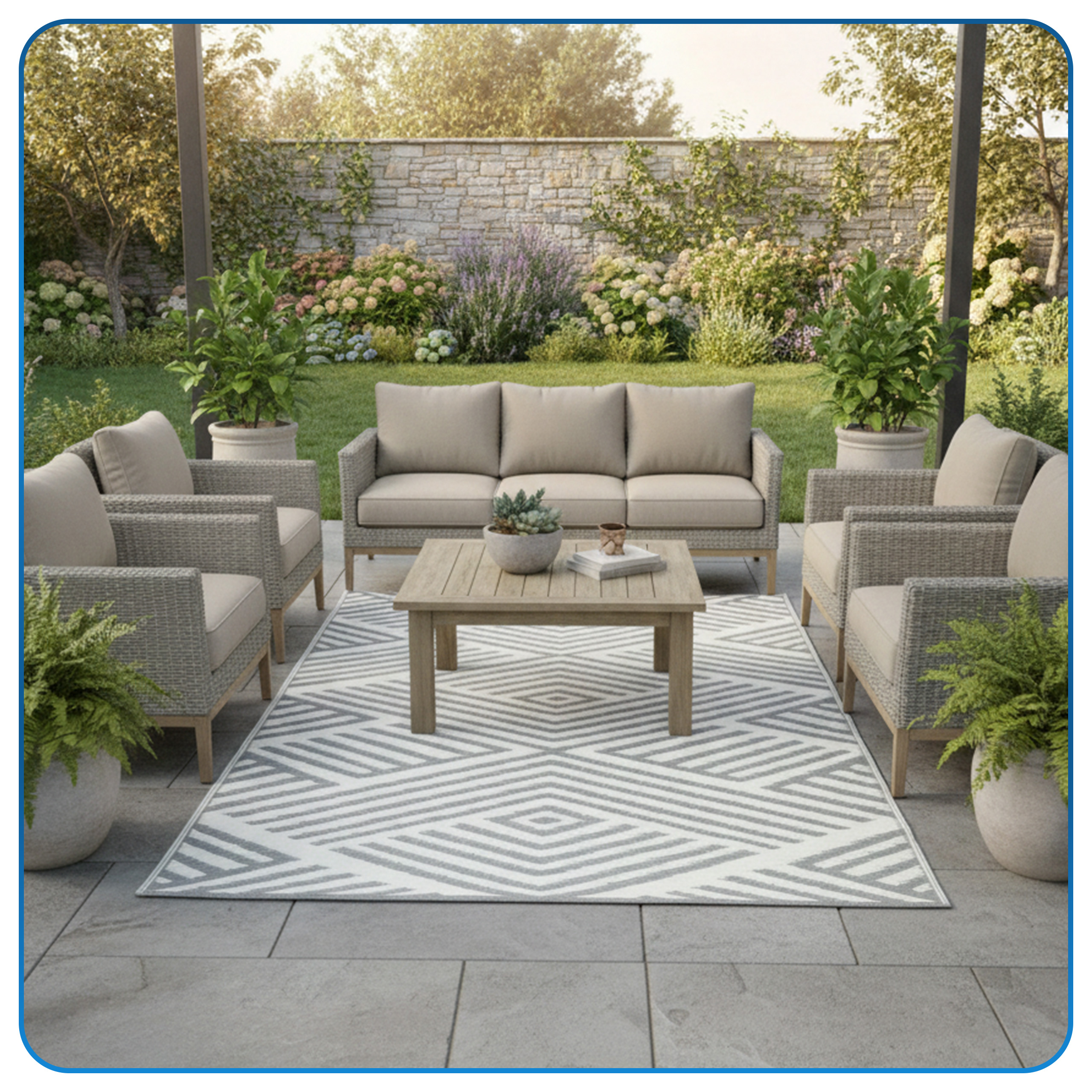 Dwustronny wzór to praktyczne rozwiązanie dla osób, które lubią od czasu do czasu odświeżyć wygląd swojej przestrzeni. Gdy jedna strona się opatrzy, wystarczy odwrócić dywan, aby w prosty sposób nadać tarasowi, balkonowi lub ogrodowi nowy charakter. Bez kupowania kolejnych dodatków zyskujesz większą swobodę aranżacji i łatwy sposób na szybką metamorfozę strefy wypoczynku.
